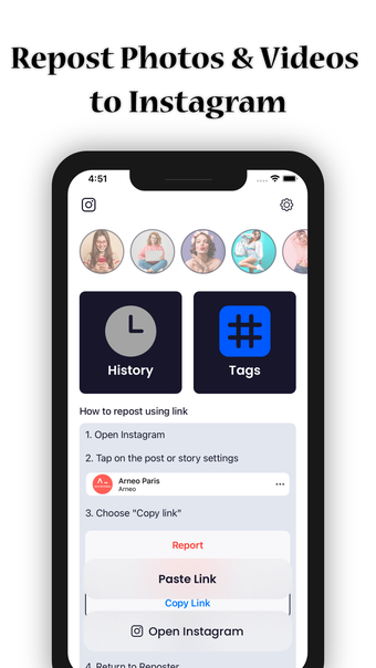 もう1つの便利な機能は、元のキャプションを自動的にクリップボードにコピーすることです。これにより、Instagramでリポストを作成する際に元のキャプションを簡単に貼り付けることができます。さらに、Repost: Instagramはリポスト履歴を保存し、ユーザーが自分のリポストを表示して友達と共有することができます。